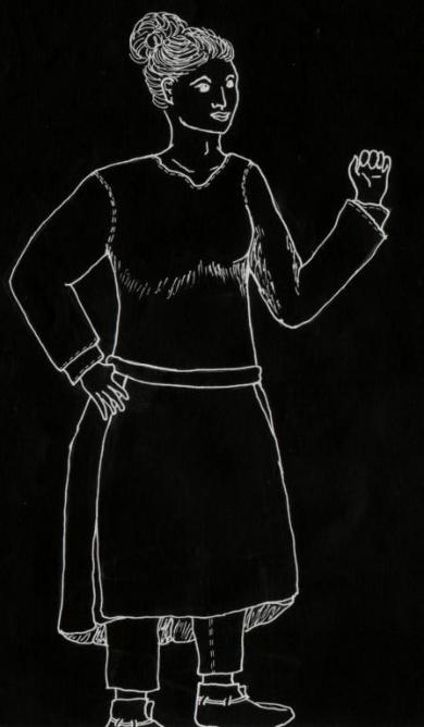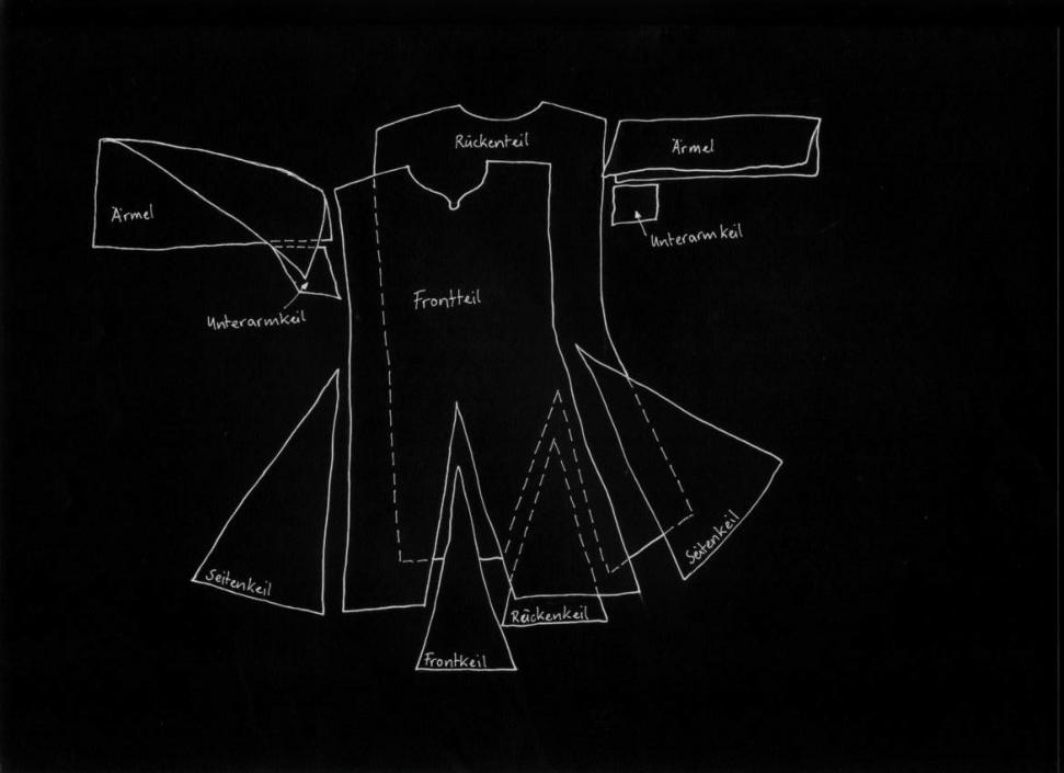 Nachdem ich akut ein Arbeitsgewand brauche, mir keinen Diamantköper leisten kann und obendrein eh genug heftig aufgerüschte Wikingerdarsteller unterwegs sind (warum auch nicht, sind ja super schöne Klamotten), hab ich mich entschieden, nur den Schnitt zu übernehmen, und das Verzieren für ein anderes Gewand aufzusparen. Die kurze Rockform, die hineininterpretierte Hose und die Schürzenform machen die Gewandung für mich zum Arbeiten (a.d. Markt) sehr attraktiv.Um eine nähere Vorstellung zu bekommen, hab ich mir das ganze nochmal schnell von der ersten Zeichnung abgepaust, und entsprechend meinen Bedürfnissen sämtlichen Firlefanz weggelassen.Bild (Frauengewandung03)>Ich finde, das sieht nicht übel aus, und könnte echt was Brauchbares werden. Die Schürze werde ich angelehnt an eine Schuhmacherschürze, und da ich oft mit scharfen Werkzeugen arbeite, aus stärkerem Leder machen, sodass sie beim Arbeiten eine Schutzfunktion erfüllt.Das Unterkleid wird wie immer, dank meiner Unverträglichkeit von Wolle, aus Baumwolle, und zwar meinem heißgeliebten billigen Baumwollnessel vom schwedischen Möbelhaus. Vielleicht färb ich es diesmal auch in eine andere Farbe um… Braun z.B. könnte ich mir schön vorstellen.Das Überkleid wird aus einem Reststück vom Flohmarkt, mit ein paar Mottenlöchern drin genäht… heller Wollstoff der wollweiss und hellem graubraun Fischgrat-Köper gewebt ist. Vom Muster her eigentlich zu schade für ein Arbeitsgewand, andererseits mit den Mottenlöchern (die natürlich gestopft werden) wiederum genau richtig und ich weiß eh nicht, was ich sonst damit anfangen sollte. (Hab ich erwähnt, dass ich finde, dass die meisten Klamotten auf den Märkten viel zu neu aussehen? Mut zur Lücke bzw zum Loch!) Wie im Bild werde ich das Überkleid hinten etwas länger als vorne machen.Bei der „langen Unterhose“ übernehme ich einfach den Schnitt von der Thorsberghose.Kurz noch ein paar Tips zu den Maßen bzw bei der Schnittmustererstellung:Meine Schnittmuster sind schlicht aus Rechtecken, Quadraten und gleichschenkligen Dreiecken zusammengesetzt, und ich male mir gerade bei Reststücken die Stoffbahn im Maßstab 1:10 auf Karopapier auf und puzzle die Teile dann mit Bleistift so lange in das Stoffbahn-Rechteck, bis ich so gut wie keinen Verschnitt mehr habe. (Bild mit Schnittmuster Kleid, Frauengewandung04)Klar zu erkennen ist auf jeden Fall (auch wenn die Darstellung wie fast jede Abbildung aus der Wikingerzeit stark stilisiert ist) dass die Frau eine Schneckenfrisur am Hinterkopf trägt, ein Kleid und einen Gürtel.Auch die 3 Reihen Perlenketten sind deutlich zu erkennen. Beim Rest wird es schon schwieriger…(weniger eindeutig)Unterhalb des Gürtels ist an ihrer Vorderseite ein Feld abgesetzt, das sich deutlich vom Rest ihres Kleides unterscheidet. Ein paar Überlegungen hierzu:-Sie trägt eine Art Frack über einem Unterkleid, das hinten deutlich länger ist, und vorne nur bis knapp unter den Gürtel geht.-Sie trägt einen Umhang, der wie eine Schleppe irgendwo an ihrem Rücken befestigt ist (zB an den Schultern aufgenäht)-Sie trägt eine Schürze, die am Gürtel befestigt ist.Ich hab mich für die Variante Schürze entschieden, weil sie mir am besten gefällt. Die „Schürze“ ist mit einem feinen Rautenmuster verziert. Mit meinem Wissen über die verarbeiteten Stoffe der damaligen Zeit und ihrer Verzierung halte ich es für am wahrscheinlichsten, dass hier ein Stoff mit Diamant- bzw. Rauten- Köperbindung dargestellt ist. Andere Möglichkeiten wären, das die Schürze irgendwie mit Ziernähten oder zB aufgenähten Kordeln oder etwas ähnlichem mit diesem Muster verziert wurde.Der Gürtel ist ebenfalls verziert, und in Felder aufgeteilt. Dies könnten Bronze oder Knochenbeschläge sein, ein Gürtel aus gemusterter Brettchenborte, oder ein besticktes Stoffband mit dem die Schürze gehalten wird.Das Kleid ist auf jeden Fall deutlich kürzer als die Kleider bei anderen Frauendarstellungen. Bei allen mir bekannten Abbildungen von Wikingerfrauen reicht deren Kleid /Gewandung bis zum Boden und bildet hinten noch eine Schleppe, die über den Boden schleift. (Einer der Hauptgründe warum mir DIESE Darstellung so gut gefällt, dass ich mir ein Gewand danach machen möchte… Schon mal versucht im langen Kleid Holz zu hacken?) Und es scheint hinten länger zu sein als vorne. Die mysteriösen Linien auf dem Unterteil und den Ärmeln des Kleides könnte man wahlweise als Falten oder Verzierung oder Webmuster interpretieren. Auch auf dem Torso-Teil lassen sich ähnliche Linien sehen, wenn auch sehr viel schwächer ausgeprägt. Wenn man jetzt nochmal genauer hinschaut, merkt man, dass die Linien auf den Ärmeln Kurven haben und zusammenlaufen, während die unten am Rock einfach gerade sind.Das lässt mich darauf schließen, dass es sich um eine Verzierung handelt. In Birka und Jorvik wurden mehrere Kleidungsstücke gefunden, auf die als Verzierung Kordeln oder fingergewebte Bänder aufgenäht wurden (so eine Art Freundschaftsband-Flechttechnik) Der Rand an den Ärmeln lässt sich am ehesten als Unterkleid, das aus den Ärmeln lugt, oder eine Verzierung am Ärmelsaum (zB Brettchenborte, andere Applikation oder Stickerei) deuten. Ich hab mich für die Unterkleidvariante entschieden.Gegen das Webmuster spricht am ehesten, das mir für die Linien als Möglichkeit nur Fischgratköper eingefallen ist, und den sähe ich eher in den Ritzlinien auf der Hose des Mannes, den die Frau festhält. (wie gesagt, MEINE Interpretation… macht eure eigene! ;-))Dann wäre da noch das seltsame Dreieck am Hals der Frau, und der kleine runde Knubbel darunter.Bei dem Dreieck habe ich an Kleeblattfibel oder Halsschmuck gedacht (wegen der Linie durch das Dreieck und rund um den Hals, aber entschieden, das die Linie wohl eher ein Sprung durch die Schnitzerei ist. Wenn man näher hinschaut, berührt die Spitze vom Dreieck das Ohr…. Also vielleicht ein Ohrring? Aus dem slavischen Bereich sind mir 