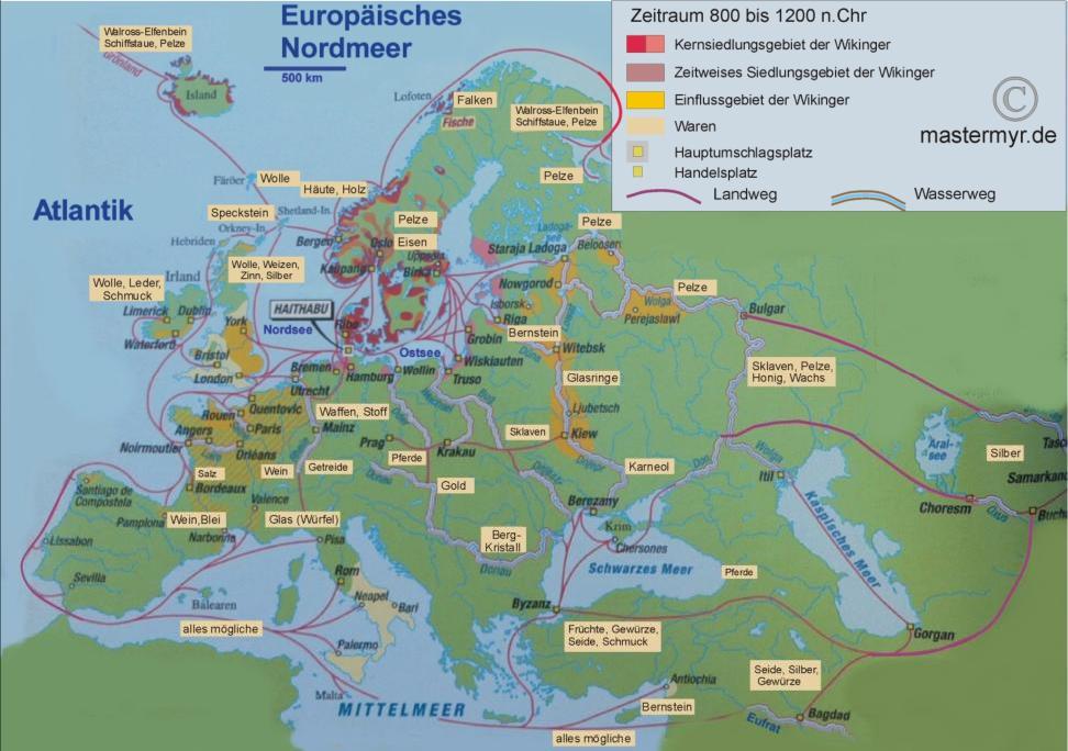ProdukteLogo-MusterNachgewiesene HandelswegeHacksilber als internationale WährungWas wurde zur Zeit der Wikinger 800-1200 n.Chr. nachweislich gehandelt und wie waren die Handelswege?hier gehen die Meinungen und die Erkenntnistände extrem auseinander, in den letzten Jahren musste immer wieder “nach-gebessert” werden, da die Wege des Handels, sein Ausmass, aber auch die Vielfalt der Waren gewaltig unterschätzt wurden. Erst durch weitere Funde entstand die Notwendigkeit, einen wesentlich ausgeprägteren und organisierteren Handel zuzugestehen.In der Karte habe ich versucht, den derzeitigen Stand der Erkenntnis darzustellen, ich vermute, bis die Grafik fertig ist, stimmt sie schon nicht mehr.Eine der neuen Erkenntnisse ist das Schiffs-Wrack ULUBURUN, dessen Bergung ich teilweise selbst miterleben konnte, da es direkt vor der Küste stattfand, wo meine türkischen Freunde ein Fischrestaurant betreiben. Viele der Mitarbeiter waren dort und in den Tschai-Hanis (Teestuben) zu Gast, und ich war auch mehrmals in deren Lager. Hier wurde ein Transportschiff aus der Zeit um ca 1600-1300 v.Chr. mit ca 22000 Tauchgängen erforscht und fast alle Güter geborgen (Schiff Uluburun bei WIKI). Hierdurch musste man die bis dahin bestehenden Vorurteile komplett revidieren, die bisher gegenüber den gefundenen Lieferlisten geherrscht hatten ( nämlich, dass diese hoffnungslos übertrieben waren ). Nein, die gefundenen Lieferlisten haben exakt gestimmt, es befanden sich ca 35 Tonnen Waren an Bord (auch diese Tragkraft wurde bestritten), Zitat Wiki:Das Schiff hatte 354 Kupferbarren in Ochsenhautform und 121 plankonvexe (Brotlaibform) Barren (insg. ca. 10 Tonnen), Zinnbarren (ca. 1 Tonne), Blauglas (ca. 350 kg), Terebinthenharz, Ebenholz, sowie Elfenbein an Bord. Daneben wurden Eicheln, Mandeln, Feigen, Oliven, Granatäpfel, Töpferwaren, sowie Schmuck aus Gold und Silber, Bronzewerkzeuge und Waffen an Bord gefunden.Darüber hinaus eine grosse Menge von Schmuck- und Luxusgütern, darunter ägyptische Juwelen, Ostsee-Bernstein, sowie ein goldener Skarabäus der ägyptischen Königin Nofretete. Darüber hinaus Abrechnungen, Lieferlisten, und sehr genaue Gewichte zum Abwiegen von Waren.Lest doch mal bei Wiki nach!Auf jeden Falll stammten die Waren, neben den Mittelmeerraum, schwarzem Meer, auch aus Asien, aus Afrika, aus der Nord- und Ostsee, sowie England. So weit verzweigt war das Netz auf jeden Fall schon. Und die Nordvölker waren auch schon jetzt, 2100 Jahre vor der offiziellen Wikinger-Entstehung, an diesem Handel beteiligt. Wer nun welchen Teil und welche Routen befahren hat, das wird nicht so leicht zu klären sein, ist aber ein wahnsinnig spannendes Forschungsgebiet.Handelsgüter und Wege seit den Phöniziern bis zu den Wikingern mazHandel mazHandel mazHandel