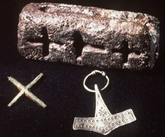 Ibn Fadlanaus Bagdad besuchte 922 n.Chr. die Rusen, sein Bericht wird 1923 in Mashad (Iran) entdeckt. Er reiste mit ca 3000 Kamelen und 5000 Personen im Auftrag des Kalifen bis an die Wolga, lernte dort u.a. die Wärägischen Rusen kennen (Wikinger an der Wolga, ein Handelsstützpunkt, die Anfänge Ruslands). Auf die Einladung hin besuchte ein arabischer Händler (Ibrahim ibn Ahmed At-Tartûsch) 945 Haitabu, das Zentrum des Wikingerhandels. Eine der wenigen Quellen für Beschreibungen von Dritten, also nicht der Kirche, und sie sind sehr aufschlussreich. Ein Detail führte dann zu einer archäologischen Sensation: Der Kaufmann wundert sich in seinem Bericht über eine Gussform, die neben Thors Hammer auch noch das christliche Kreuz enthielt (siehe Bild links). So viel Pragmatismus hätte er bei der Herstellung religiöser Symbole nicht erwartet. Bei Ausgrabungen in Haitabu fand man später genau diese beschriebene Gussform, die Geschichte war durch den Fund belegt. Der Traum jedes Archäologen.Na ja, und praktisch ist es sowieso, oder?Ja und die zweite Geschichte reicht bis in die Jetztzeit:Da gab es einen Harald Blauzahn (nachdem wirklich Bluetooth benannt ist), und der hatte seine Gründe, warum er ca 950 n.Chr offiziel mit dem Christentum liebäugelte. Er erkannte die Deutsche Hoheit an, heiratete (unter anderen eine deutsche (Mistiwoi) und bekam dafür profitable Handelsmöglichkeiten eingeräumt. 10 Jahre später liess er sich am POPO-Stein(der Abgesandte der Kirche hiess wirklich POPO) taufen, nicht ohne vorher noch schnell versucht zu haben, gegen das römische Reich (Otto,der Erste) vorzugehen, erfolglos. Dann erschien ihm das Arrangement mit den Deutschen lohnender, Popo hin oder her, er konnte das Staatsgebiet mit deutscher Duldung deutlich bis ins Herzogtum Schleswig ausweiten. Durch weitere Bündnisse (+Todesfälle) und politische Seitenwechsel wurde er auch noch König von Norwegen. 974- 983 erneut Aufstand gegen Kaiser Otto (jetzt der 2te) und Unterstützung des Slaven-Aufstandes, also wirklich ein bewegtes Leben, würde ich sagen, aber: Sein Sohn wollte Wikinger bleiben und stritt sich mit seinem Vater über Christentum / Wikingertum. Dieser Streit wurde sogar zur See ausgetragen, ohne sichtbares Ergebnis, ausser: Bei der Landung “verirrte” sich ein Pfeil und setzte dem Leben des Blauzahn ein Ende. Schade eigentlich.Da war schon einiger Pragmatismus enthalten, aber am schönsten finde ich den Gedenkstein (siehe rechts), den er für seine Eltern (Papa Gorm, Mama Thyra) herstellen liess: Runenbeschriftet, mit den traditionellen Formen der Wikinger, mit den typischen “untereinander - übereinander” (auch Bänderflechtwerk hab ich schon mal gehört), also ein wunderschönes Exemplar eines typischen Runensteins - - - wäre da nicht ganz unauffällig ein Jesus am Kreuz eingearbeitet !Dieser Stein gehört mit vollem Recht zum WeltkulturerbeHabt Ihr bemerkt, was an diesem Stein “unwikingerisch” ist?das wird noch fortgesetztPragmatischWIKI-Blauzahnmacht Euch mal den Spass, und lasst jemandden Runenstein auf Unstimmigkeit untersuchent, ohne vorher die Erklärung zu lesen.Oder probiert es gleich selber. mazPragmatisch mazPragmatisch