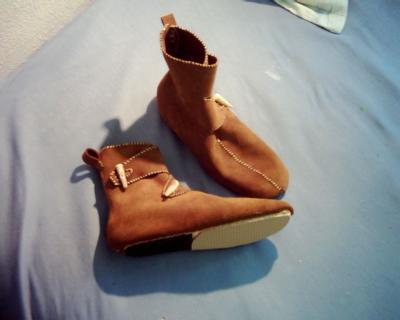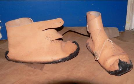 Wendeschuhe für ReenactorDie Schuhe sind im Reenactment die "Stiefkinder" der Ausrüstungs-gegenstände. Wie genau es jemand nimmt, kann man meist einwandfreian den Schuhen erkennen. Ich seh da echt noch Entwicklungspotential.Was einem zumeist für teuer Geld auf den Märkten angedreht wird,hat mit Replik normalerweise rein gar nichts zu tun, und siehtmeist nicht mal ansatzweise so aus. Durchaus gut gemachte und schöne Schuhe, aber eben nicht authentisch.Woran das liegt? Ganz einfach: erstens kennen sich die allermeistenSchuhmacher nicht die Bohne mit Wikinger-Schuhwerk aus und befassen sich auch nicht näher damit. Zum anderen benutzt man für einen Wendeschuh andere Techniken,die man sich ggf erst aneignen muss, und die zugegebenermassen nicht mehr Bestandteil ihrer Ausbildung sind. Es müsste also schon persönliches Engagement sein.(Um kurz auf die Unterschiede im Schuhbau einzugehen: Die Wikinger, und eigentlich alle Völker im Europäischen Raum, haben, von der Frühgeschichte bis ins Spätmittelalter hinein, Wendeschuhe hergestellt und getragen. Diese werden mit der Innenseitenach außen zusammengenäht, also „auf links“, und dann gewendet (Da kommt der Spruch: „Umgekehrt wirdein Schuh draus.“ her) die Nähte, mit denen das Oberleder ans Sohlenleder gefügt wird, liegen also innen.http://de.wikipedia.org/wiki/WendeschuhIm Gegensatz dazu, stellt ein heutiger Schuhmacher in der Regel einen rahmengenähten Schuh her. Dieser hat zur Verstärkung einen Lederrahmen an der Sohle, und die Sohle ist aus mehreren Schichten aufgebaut. Rahmengenähte Schuhe werden „auf rechts“, also mit der Außenseite nach außen, genäht.Der Aufbau ist hier: http://www.shoepassion.de/schuhwissen/rahmengenaeht in einer Grafik ganz gut dargestellt.)Und zu guter Letzt: die Nähte, die man für einen Wendeschuh braucht, lassen sich mit einer Nähmaschine (ausser Ledernähmaschine) nicht machen, es muss komplett von Hand genäht werden, und das kann sich zu einem vernünftigen Stundenlohn keine Sau leisten. In der Szene kommt es eigentlich nur dann zu brauchbarem Schuhwerk, wenn man entweder das selber in Angriff nimmt, oder Hilfe von einem befreundeten Darsteller erhält, oder aber sehr viel Geld auf den Tisch eines willigen und guten Schuhmachers legt (zusammen mit einer Anleitung für Wendeschuhe). Also echt nicht leicht!Was bleibt einem als versierter Reenactor also übrig?Riiiiiiichtisch: selbamachen!Die Frage die bleibt, ist nun wie so oft im Leben: Wie zum Henker geht das???Ich für meinen Teil hab vor Jahren so angefangen: ausgehend von diversen Selbstmachanleitungen, und ein paar Tips versuchte ich, teures Leder zu Schuhen (oder so) zu verwandeln. Die ersten Schuhe waren eher “oder so”.Sprich: der Schuh sah hinterher nicht nach Schuh aus, hat nicht gepasst, das Leder war dann trotz mehrfachem nachmessen beim zusammen-nähen doch zu kurz usw. usw.Ich war ja auch kein Schuhmacher.Heute, nach vielen Jahren, Löchern in der Fingern, Blasen, versautem Material, vielen, vielen Stunden, und einigen unbrauchbaren Ergebnissen bin ich nun so weit, dass ich garantiert einen brauchbaren Wendeschuh hin-bekomme, der auch praxisgerecht ist und passt, und habe grosse Hochachtung vor dem Handwerk des Schuhmachers, besonders eines Schumachers damals.Aus Erfahrung heraus möchte ich hier noch anmerken:Wer noch nie genäht hat, egal ob Leder oder Stoff, keine Schnittmuster lesen, bzw erstellen kann, sollte erstmal mit Reststücken und billigem Stoff experimentieren, bis er das kann, sonst habt ihr keine Chance einen Schuh hinzukriegen. Solide Grundkenntnisse in der Lederverarbeitung, undauch ein wenig Wissen rund um den Werkstoff Leder sind absolut unumgänglich,und Wendeschuhe herstellen ist absolut kein anfängertaugliches Projekt.(fangt mit Messerscheiden, Taschen und ähnlichem an, bis ihr euch die entsprechenden Grundkenntnisse angeeignet habt)Unter solide Grundkenntnisse verstehe ich:-Ihr könnt mit der Ahle umgehen und Löcher mit gleichmäßigem Abstand einer Linie entlang stechen, und diese zu einer gleichmäßigen, festen Naht, zusammennähen.-Ihr beherrscht grundsätzliche Nahttechniken, wie zB die Sattlernaht, bzw Steppstich, Schlingenstich und habt ggf sogar mit dekorativen Nähten herumexperimentiert (zB beim Stoß an Stoß nähen Kreuzförmige Nähte entstehen zu lassen)-Ihr habt bereits mit verschieden dicken und festen Lederarten gearbeitet, und ein bißchen Gefühl dafür entwickelt, welches Leder sich wie verarbeiten läßt, wie groß die Abstände in der Naht sein müssen, und was flexibel oder steif genug für welches Projekt ist.-Ihr habt schon Leder geklebt und dabei eine zufriedenstellende Klebeverbindung, die hält, zustande gebracht-Ihr könnt mit den zur Lederverarbeitung nötigen Werkzeugen soweit umgehen, das hinterher keine Finger fehlen oder nicht mehr benutzbar sind.-Ihr könnt mit dem Messer auch dickes Sattelleder zuschneiden, so daß eine glatte Schnittkante entstehtLöcher machen, Nähen, Faden, Festigkeit und Leder Qualität, kleben, Sohle .... WerkzeugeKriegt man authentische Schuhe alltagstauglich und bequem?1. Ein genaues Schnittmuster bekommt man nirgendwo. Nur die grobe Formvorgabe.2. Schuhe waren zur Zeit der Wikinger zwar ein Wegwerfprodukt (sie waren, bedingt durch die Machart, nicht wirklich reparierbar, die Sohle ca nach 6 Monaten in Fetzen, wodurch eine Menge Schuhe in den Abfallgruben gelandet sind.) von dem es viele Funde oder Fundbruchstücke gibt, nur kriegt man die nicht unbedingt als Laie zu sehen, sind halt keine spektakulären Dinger, die im Museum ausgestellt werden.3. Unsere modernen Füßchen sind nicht unbedingt dazu geeignet, in authentischen Wendeschühchen rumzuhüpfen. Die Passform ist ungewohnt, die Sohle sehr weich, und extrem rutschig, besonders auf Wiese, wenn es naß ist, geht die Nässe schnell durch, sie haben keinen erhöhten Absatz, kein Fußbett, und geben auch keinen wirklichen Halt. Sie sind also somit mit großer Vorsicht zu geni